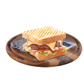 Un steak dans un pain toasté, cheddar, crudités, sauce au choix.