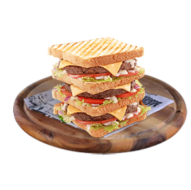 Trois steaks dans un pain toasté, cheddar, crudités, sauce au choix.